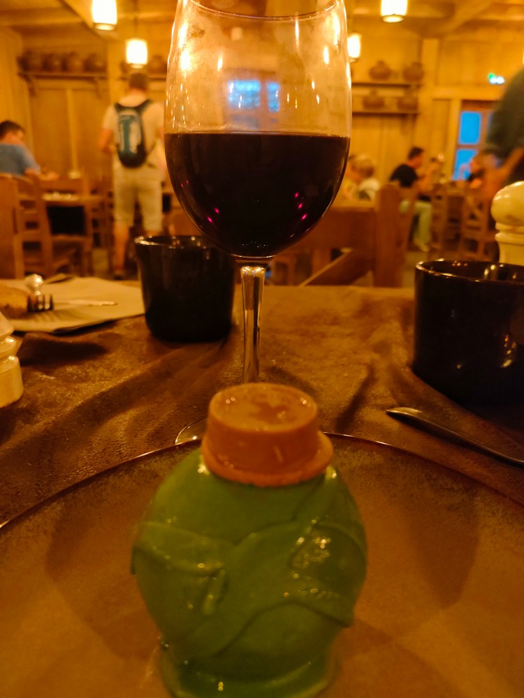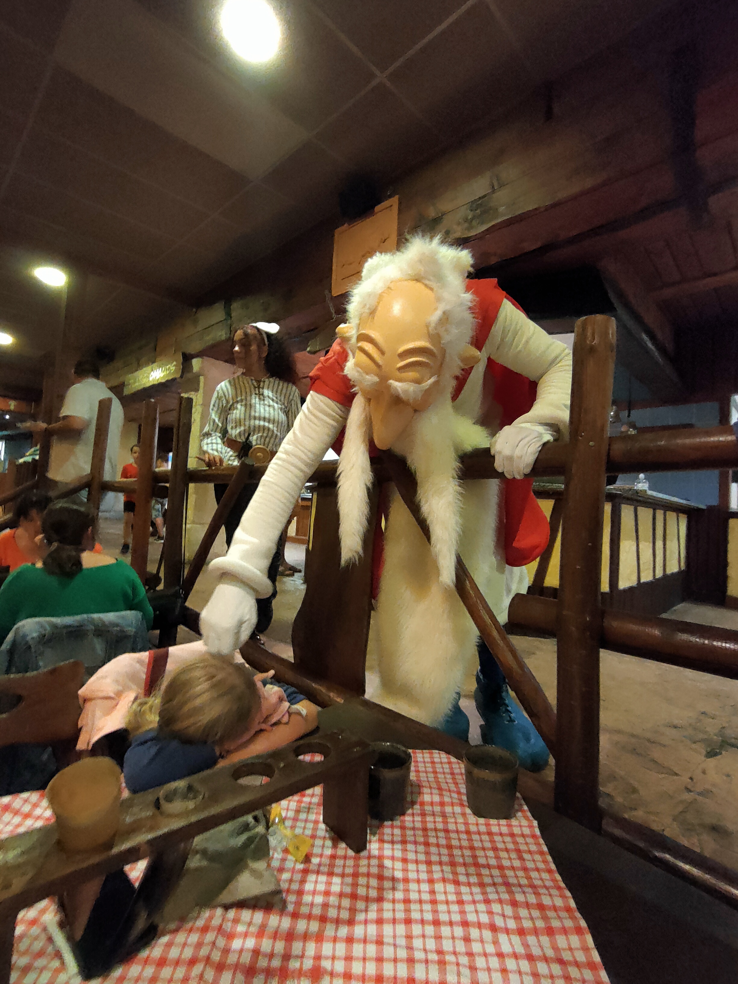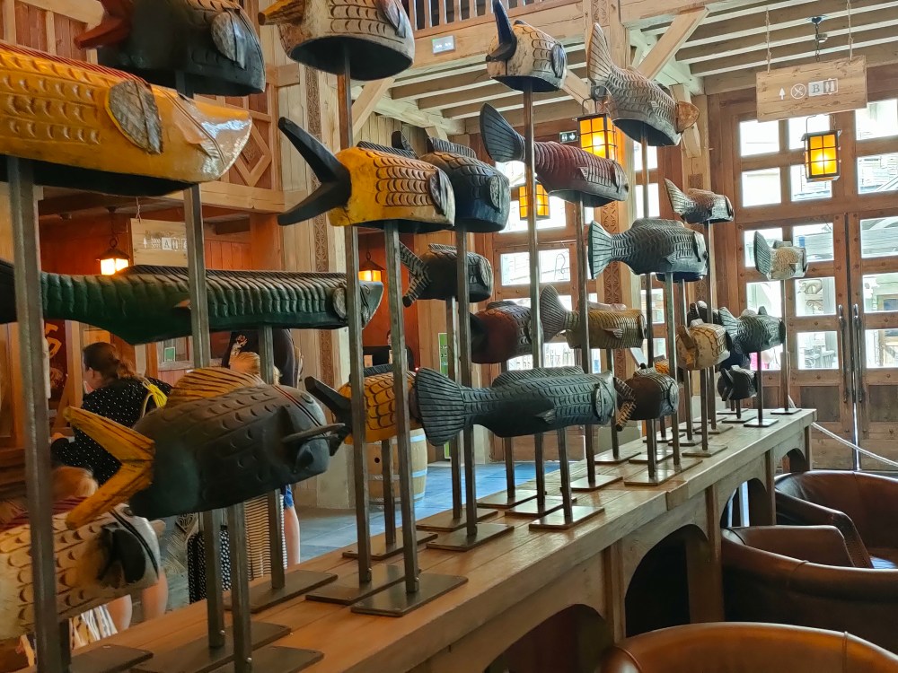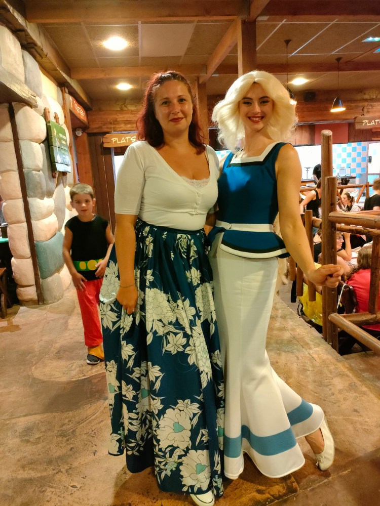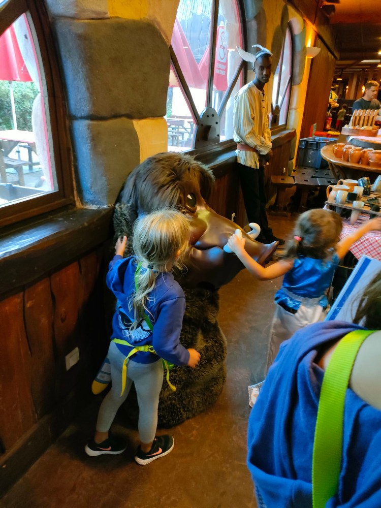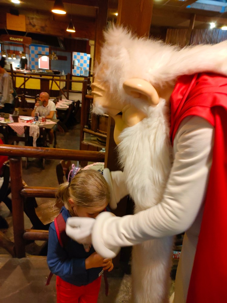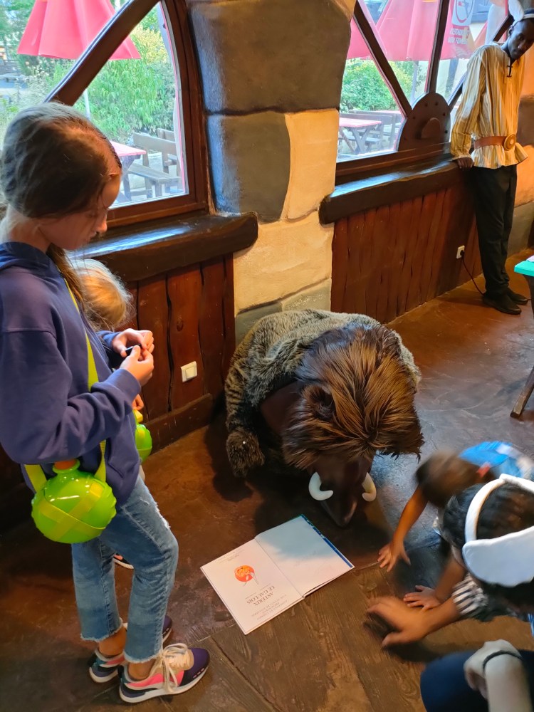 Sauf que, toi même tu sais, que dans le nord, même en aout, potentiellement, tu as de la pluie ? Donc plan B, le banquet s’est fait dans un restaurant du Parc. Mais, toujours entourés des personnages, avec des animations, des scénettes, de la musique et des fous rire en cascades.