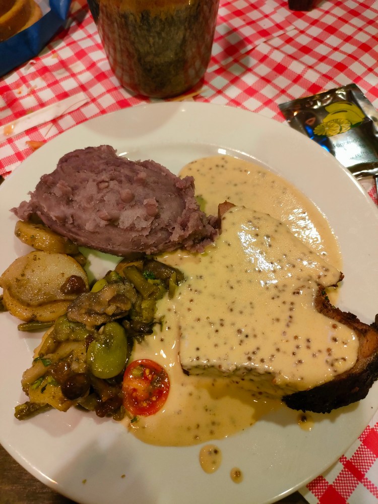 Le principe est simple, tu arrives, on te sert une corne de bienvenue et on t’installe, et parfois on t’installe même avec des gens que tu ne connais pas. Normalement on aurait du être sur une table géante au milieu du village, mais là c’était des tables classiques de restaurant. Puis, comme dans tout buffet qui se respecte, à toi le sanglier, le vin et le reste, il y en a pour tout le monde.