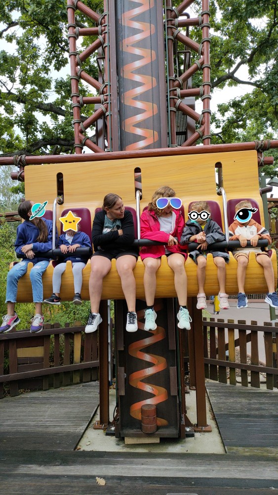 Et quand vraiment, même accompagnés, cela n’est pas possible, il existe une version adaptée pour les mini’s. Par exemple les chaises volantes. Elles existent dans la version adulte, mais aussi dans la version enfant. Pareil pour le Menhir express, cette joyeuse descente ou tu finis… trempé… elle existe pour les tout petits. C’est vraiment familial, et pas besoin de séparer les groupes et faire chacun de son côté. Et voyez plûtot cette mini version de la tour infernale qui aura eu un franc succès auprès de Chouquette !